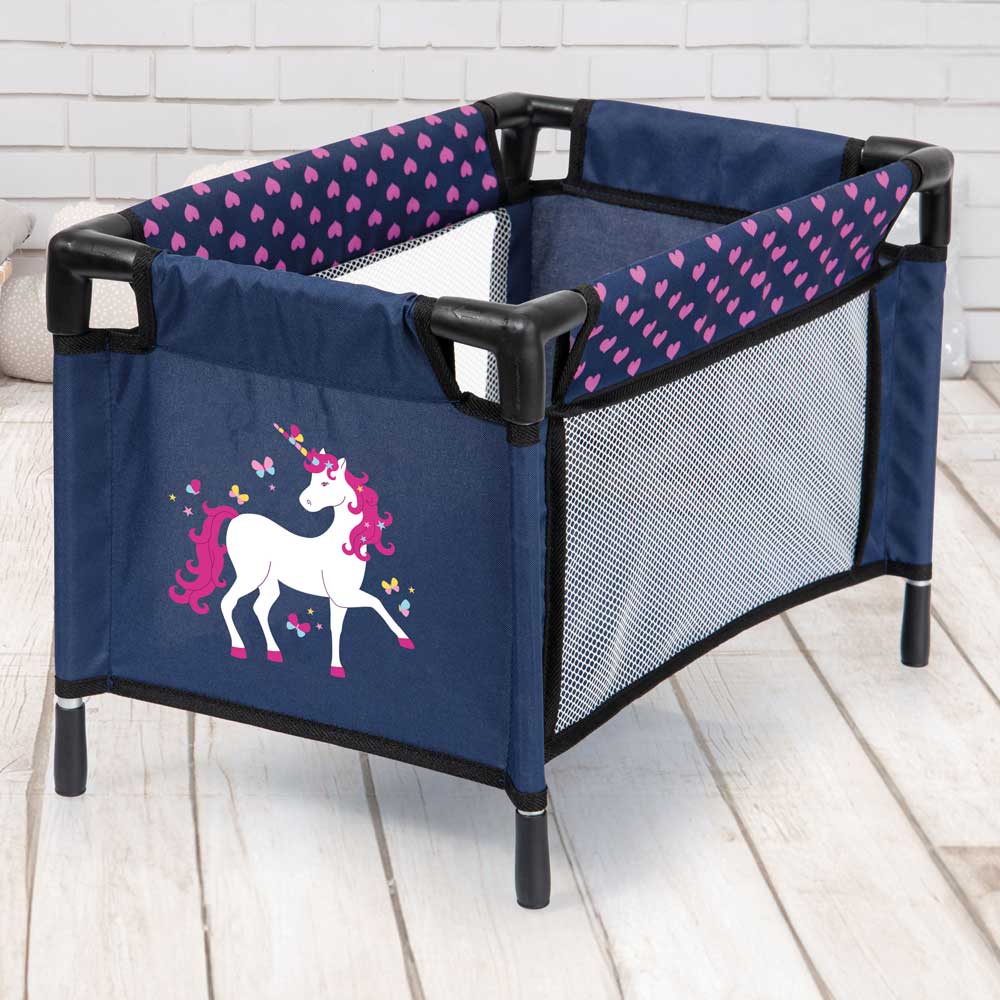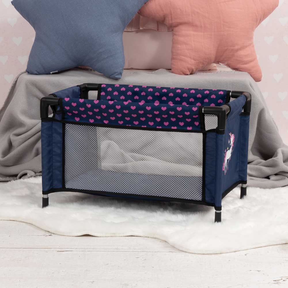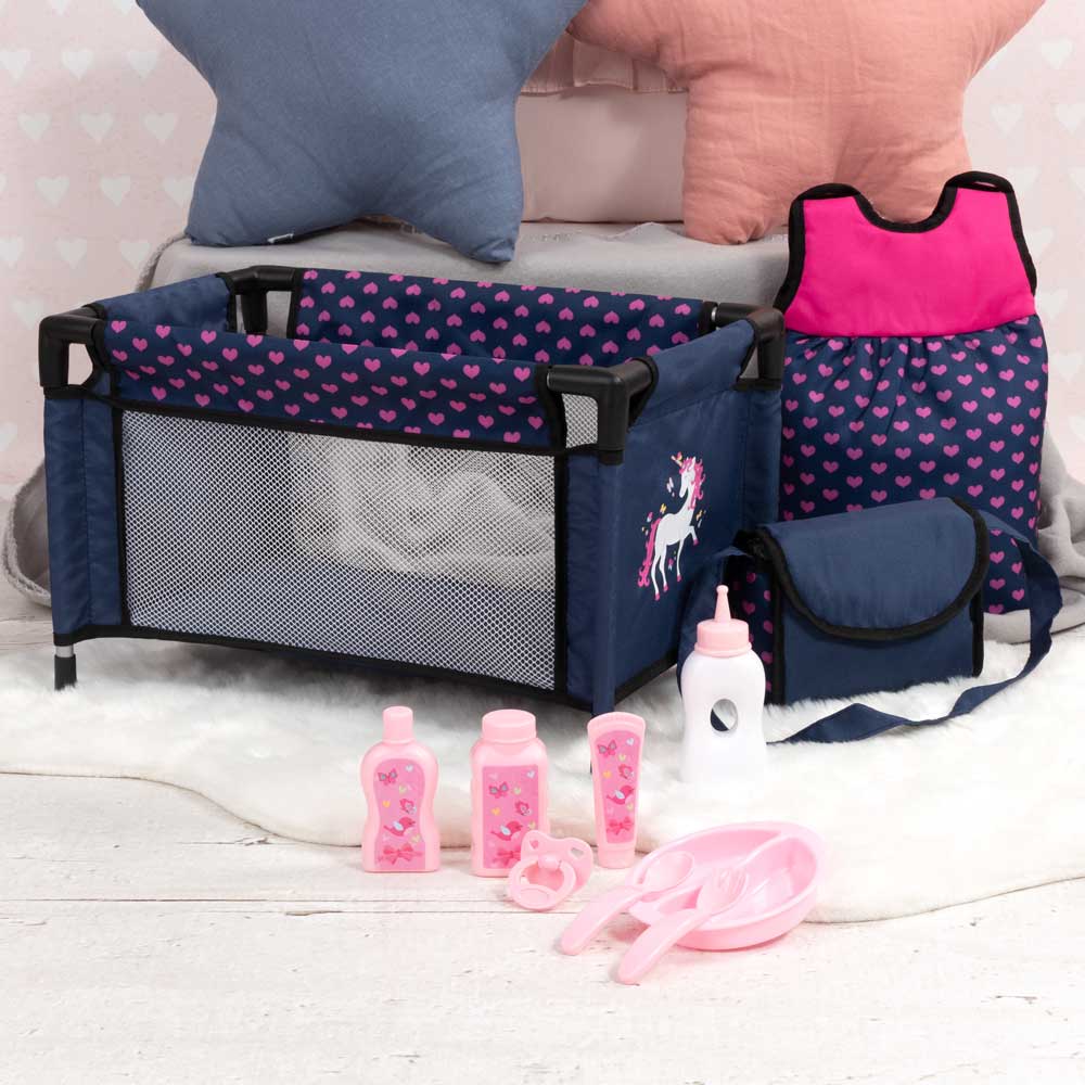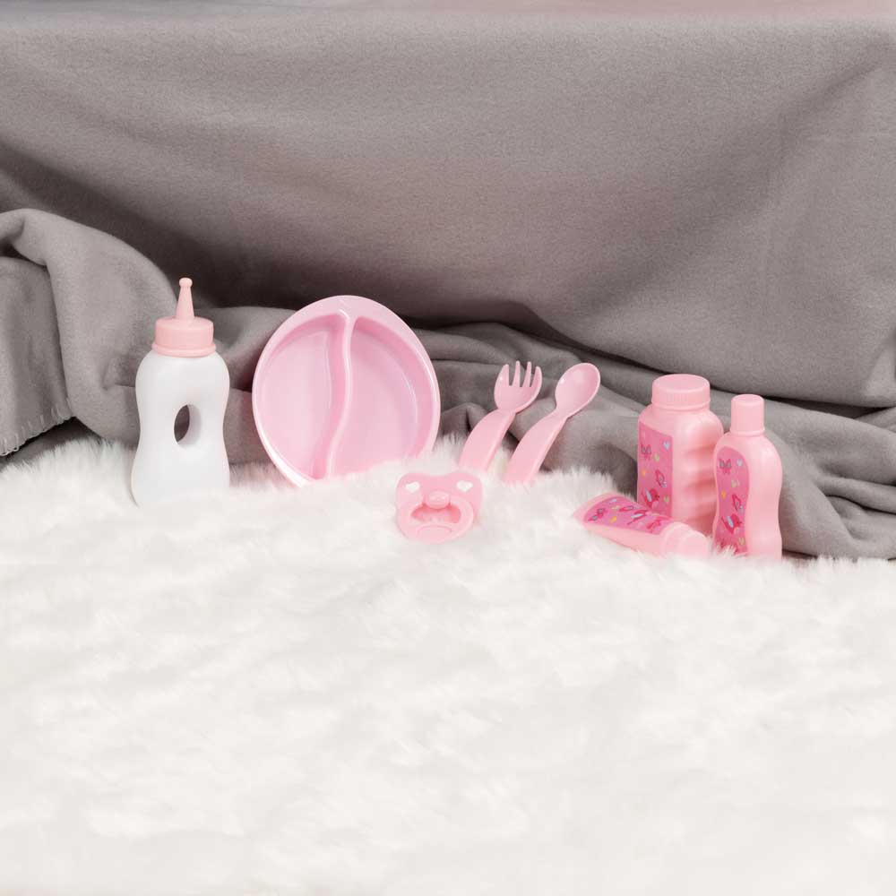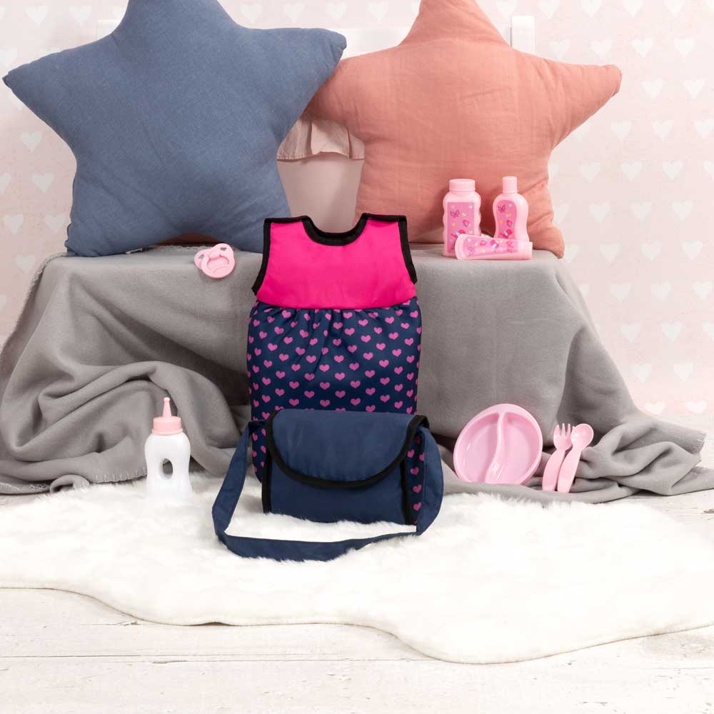 С този елегантен и съчетаващ се комплект аксесоари за кукли са възможни много ролеви игри. Леглото е подходящо за кукли до 42 см. Спалният чувал в подходящ дизайн поддържа малкото сладурче топло. За да се грижиш за куклата са включени аксесоари за грижа като играчка пудра и крем. Благодарение на приборите, чинията и шишето куклата може да бъде нахранена или утешена със залъгалката. Красивата чанта за през рамо е идеална за съхранение на всичко необходимо за следващото пътуване.
