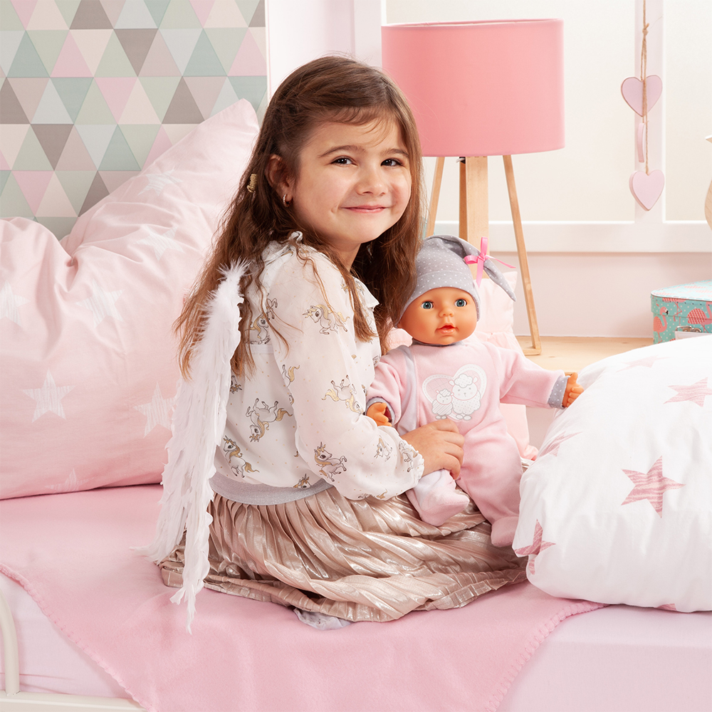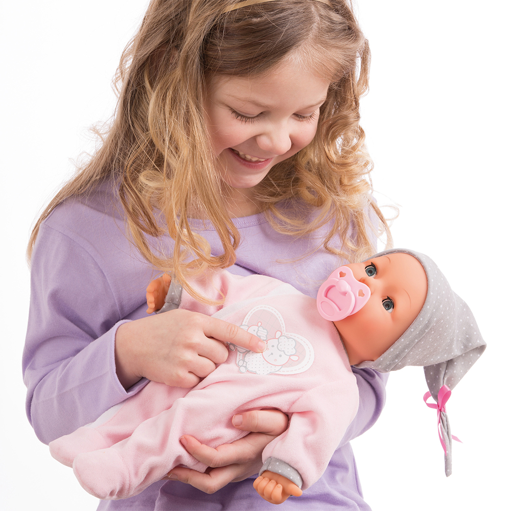 Характеристики: • Чаровното бебе Piccolina ще се превърне в любимата играчка на малките майки! • Тази кукла има 26 различни функции. • Ако ѝ дадеш шишето, тя ще движи устните си, имитирайки и издавайки звук на сучене. • Натисни коремчето ѝ и ще чуеш различни звуци: на бебешки смях и плач, хленч, спокойно дишане като при сън и др. • Ако дадеш на Piccolina биберона, тя ще го засуче и ще издава подобаващ звук. • Куклата е облечена в меко розово гащеризонче и сладка сива шапка. • Играчката развива въображението и ролевите игри. Спомага за развитието на емпатията и учи децата на отговорност. Комплектът включва: • 1 бр. кукла Piccolina; • 1 бр. шише; • 1 бр. биберон. Размер на Piccolina: 38 см. Подходящ за деца над 3 години.