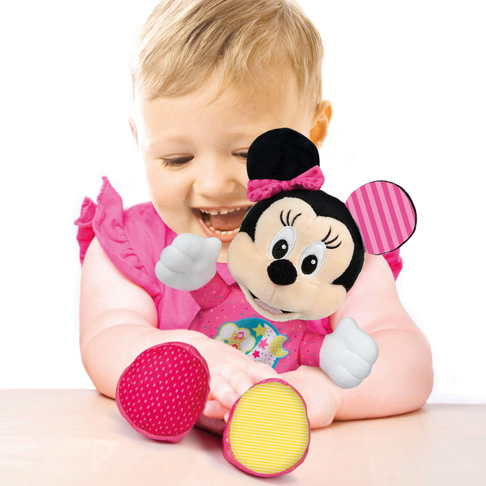 Характеристики: Любимият герой Мини Маус е тук, за да те отведе в царството на сънищата! Мини е изработена от мек плюш и е специално създадена да за гушкане. Натисни коремчето му и виж как ще засвети и ще звучи нежна мелодия. Играчката е специално разработена за стимулиране на привързаност, слухово възприятие и развитие на сетивното възприятие по време на първите месеци на живота на детето. Лесно захващане към креватче или количка. Размер: 24 см.Батерии: 3 x 1.5V AG13/LR44 (включени в комплекта с демонстрационна цел).Подходящо за деца над 3 месеца.