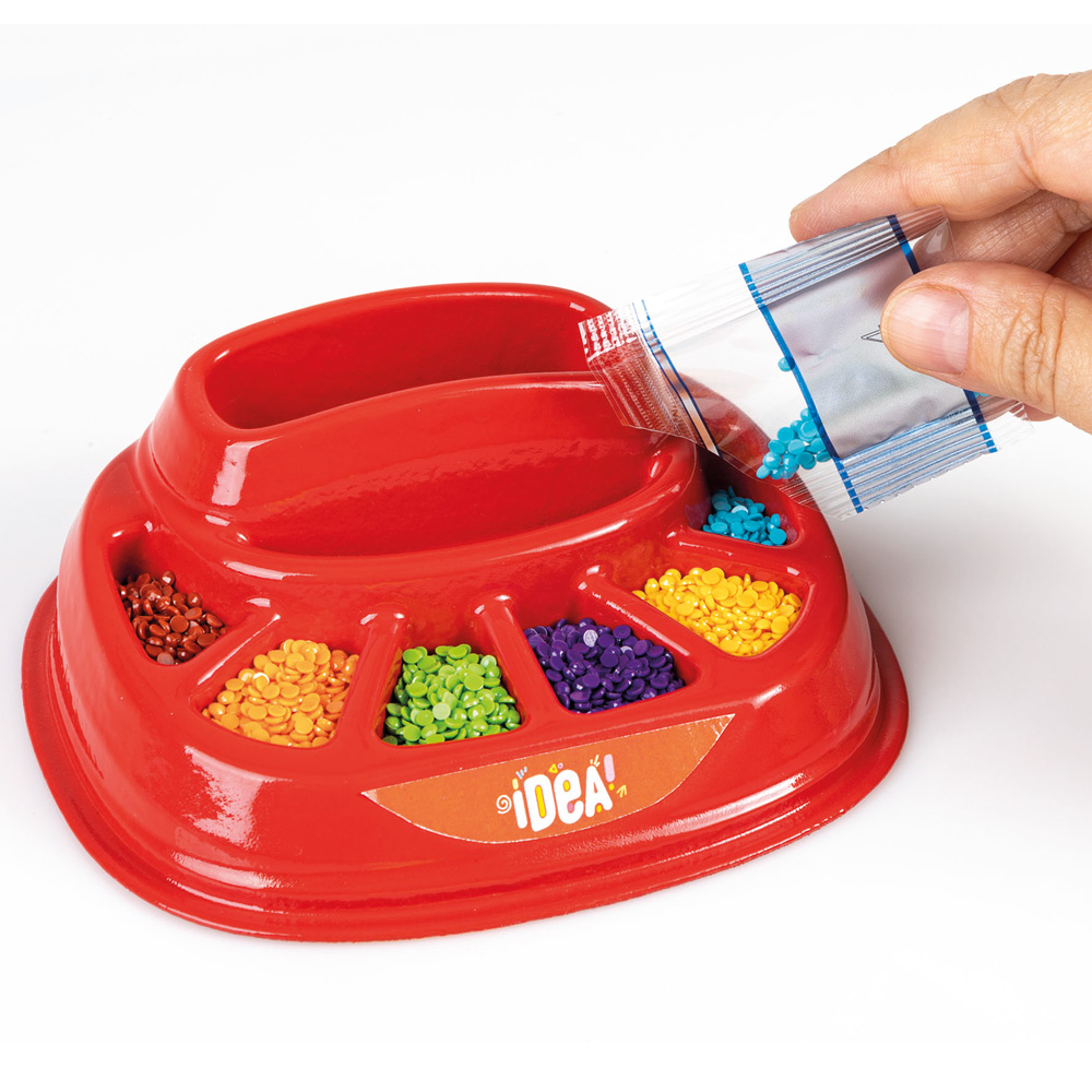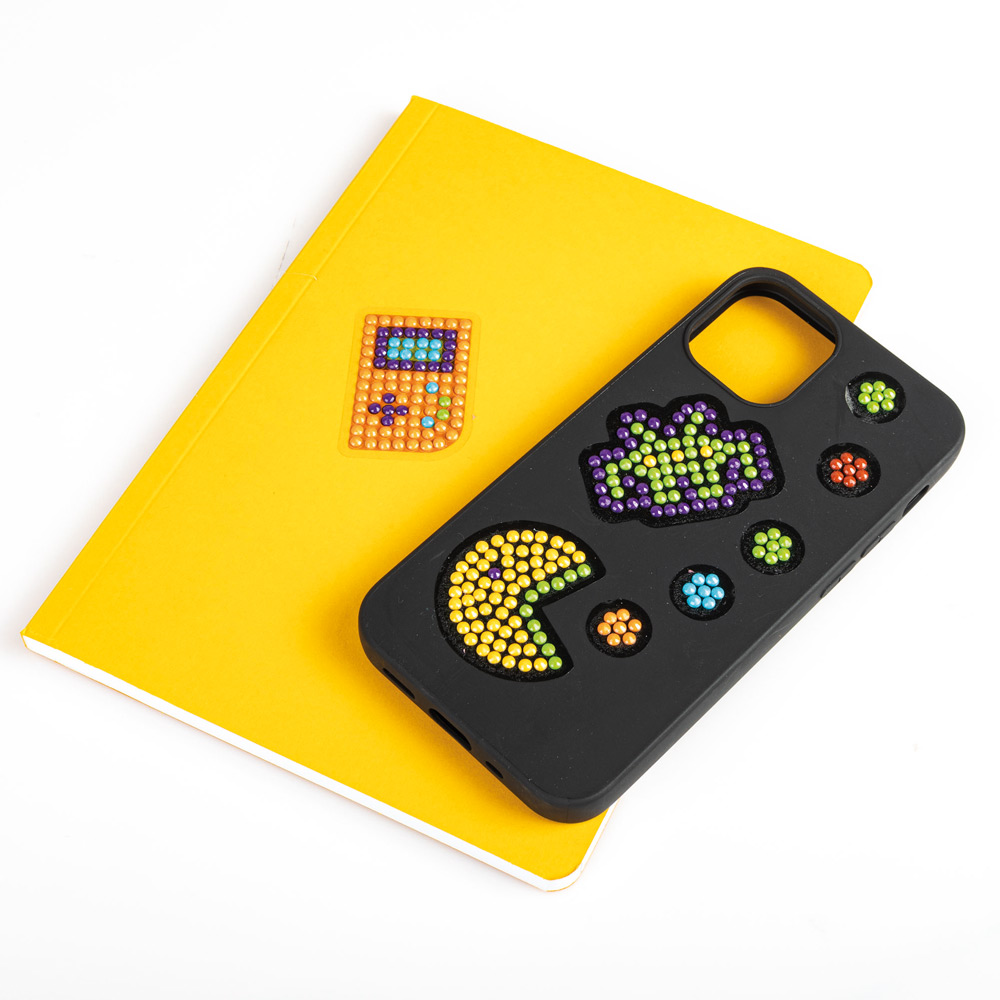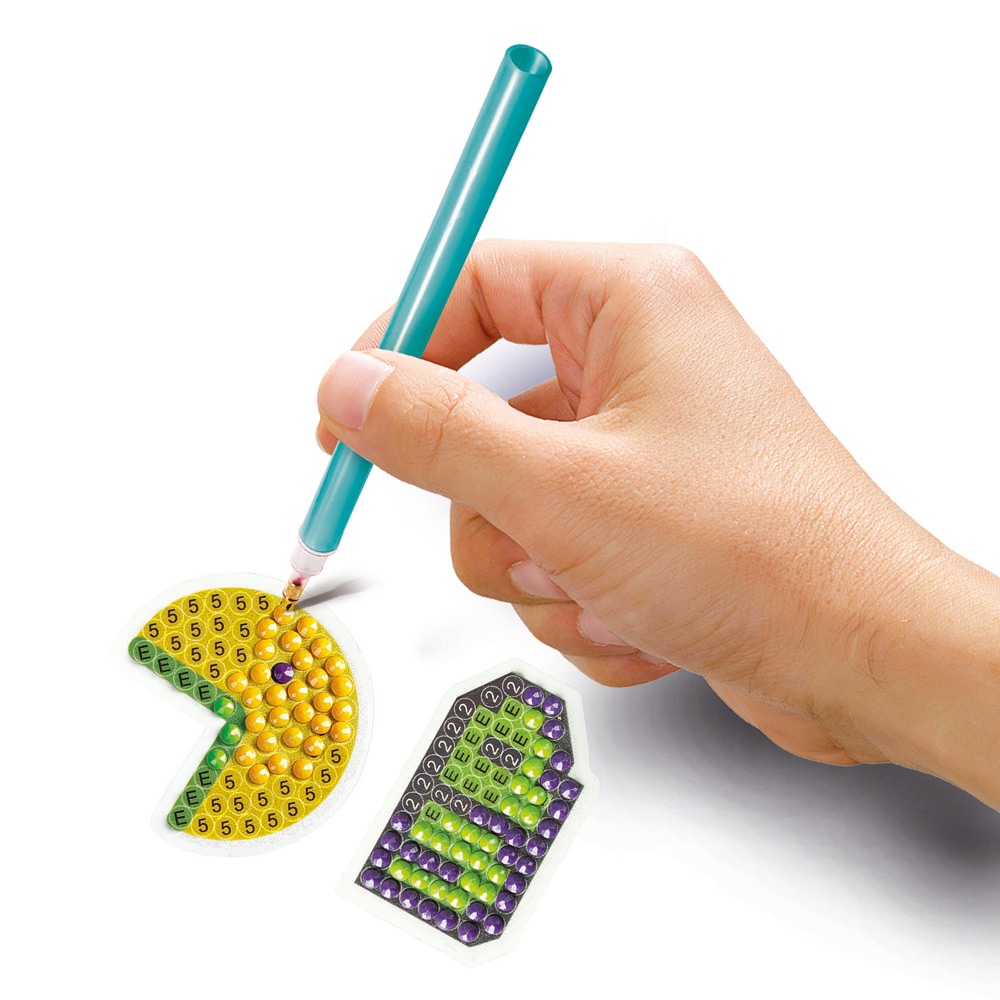 Нова игра, базирана на популярните гоблени с диаманти за създаване на блестящи и цветни творения! Благодарение на цветния шаблон и специалната писалка можеш лесно да нанасеш 3D камъчетата върху картината си с оригинален и забавен дизайн. В тази версия илюстрациите са на тема видеоигри! Благодарение на практичния органайзер за аксесоари е възможно да поддържаш всички компоненти в ред. Продуктът е замислен, проектиран и разработен в Италия. Комплектът включва: Пластмасов органайзер за камъчета; Илюстрации на двустранно залепваща хартия; 6 пакетчета с цветни камъчета; Инструмент за загребване на камъчета; Тавичка; Писалка за редене на камъчета; Лепило; Рамки за стикери; инструкция за игра. Подходящо за деца над 7 години.