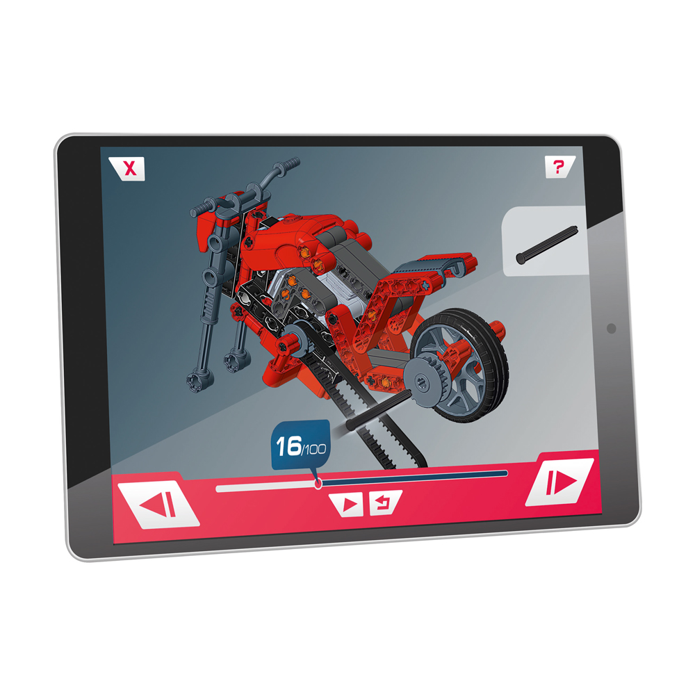Механичната лаборатория с игрална система за конструиране, която позволява на децата да създадат модели с тематичен дизайн на класически и модерни мотори. Децата може да използват своята изобретателност, за да създават собствени реалистични модели, като следват основните принципи на физиката и механиката.Развиващият се ум на децата, съчетан с тяхното въображение, ще иска да разбере връзките и разстоянието между различните части, докато строят модела си. Дейностите имат различна сложност и са подходящи за деца на възраст над 8 години, в зависимост от индивидуалните способности на детето. Брой части: 130. Подходящ за деца над 8 години.