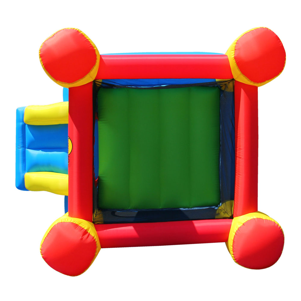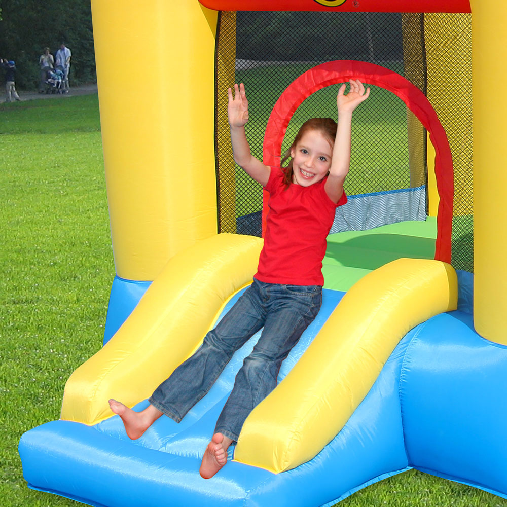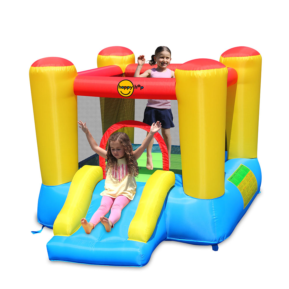 Този надуваем замък с пързалка от Happy Hops е перфектният батут за игра за деца, който може да удовлетвори тяхното желание за забавление и движение. Надуваемият батут замък с пързалка осигурява просторно място за децата да се забавляват. Благодарение на богатото оборудване, те ще могат да открият различни функции за забавление. Мрежестите стени са ефективни в осигуряването на безопасността и гарантират добра циркулация на въздуха. Колчетата за закрепване помагат да се запази стабилността на батута при вятър. Играчката може да се използва в паркове, дворове, тревни площи и други места. Размери (когато е надут): 253x200x160 см.Само за външна употреба. Помпата е с постоянен въздушен поток и не трябва да се изключва.