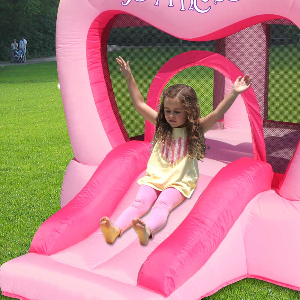 Надуваемият замък Happy Hop с коронка е перфектното място, където малките принцеси могат да се насладят на кралско забавление на открито. Този очарователен розов замък с дизайн на корона носи радостта от скачането и спускането по пързалка директно в градината. Надуваемият замък разполага с голяма зона за скачане, осигурявайки просторен интериор, в който децата могат да се наслаждават на весело подскачане. Включва и вълнуваща пързалка, която предлага радостни спускания, както и защитни мрежи, които предпазват децата от падане по време на активната игра. Максимално общо тегло: 135 кг.Капацитет: до 3 деца едновременно.Размери (когато е надут): 285x210x220 см. Помпата е с постоянен въздушен поток и не трябва да се изключва.
