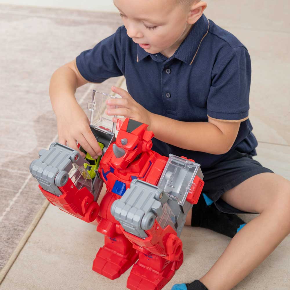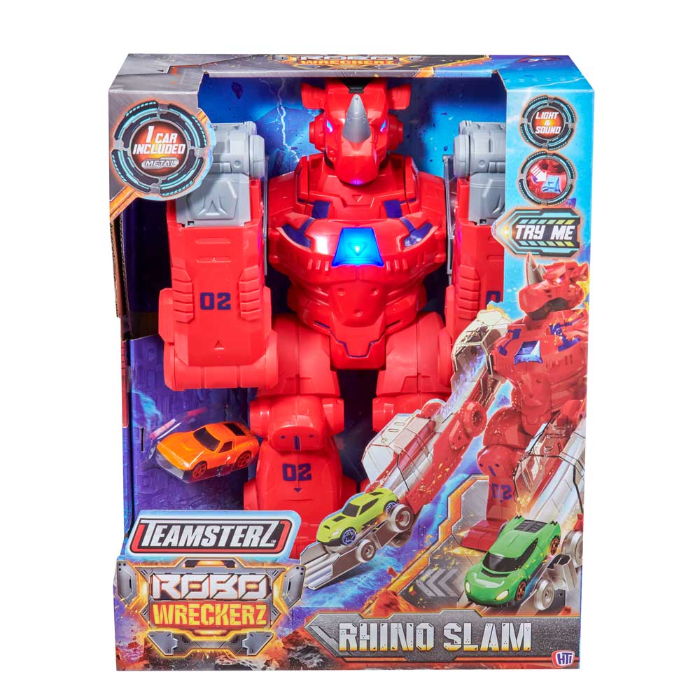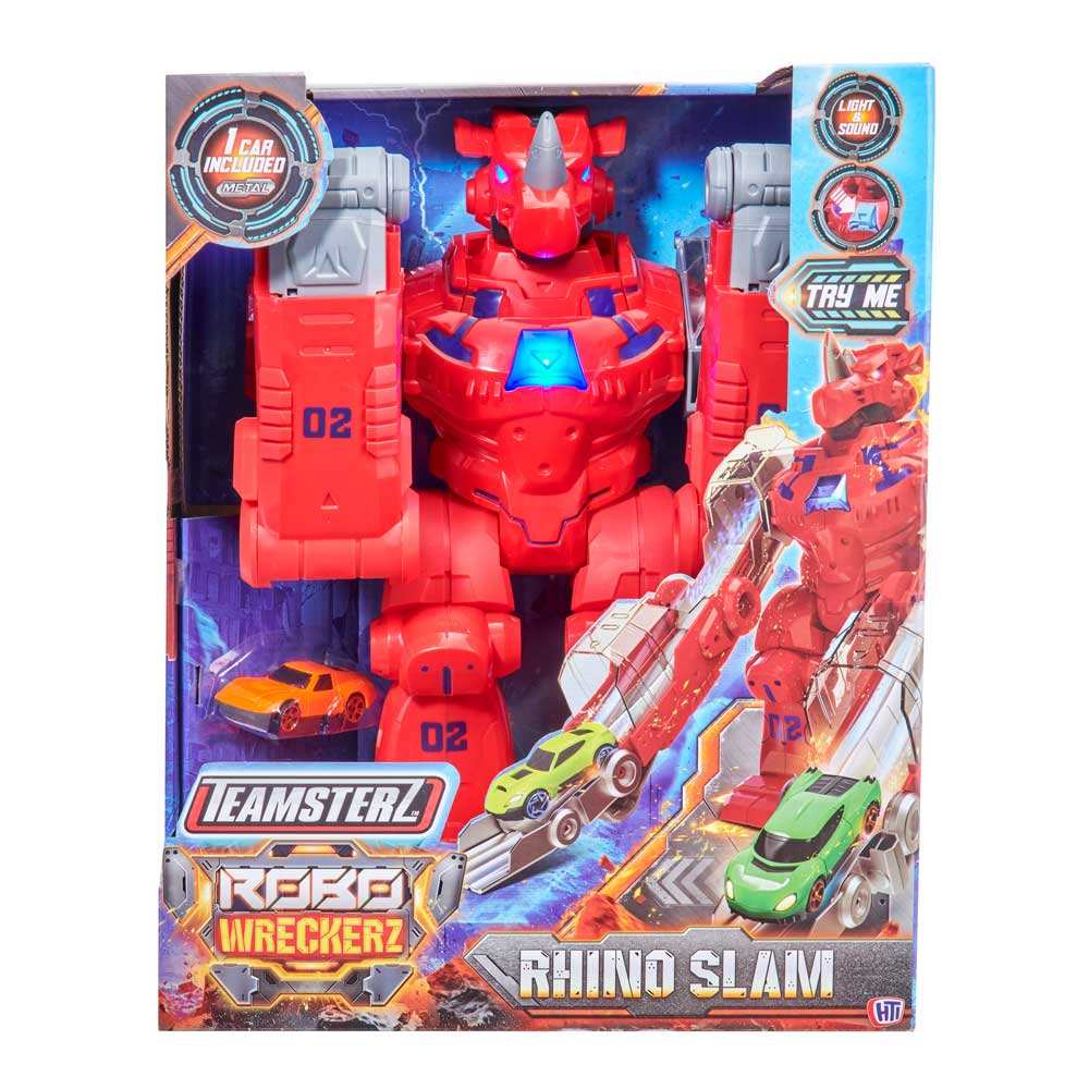 Открийте лудия и вълнуващ свят на състезанията с Teamsterz Robo Wreckerz Rhino Slam! Този вълнуващ комплект е създаден, за да завладее въображението на децата и да им достави часове наред забавление. Идеален за малки състезатели, които обичат приключенията, този комплект съчетава вълнението от състезанията с тръпката от трансформиращ се робот носорог. Вижте как носорогът оживява с едно просто натискане на главата! Мощните му ръце се превръщат в динамични състезателни писти, по които включената в комплекта кола се движи с бясна скорост. Тази уникална функция не само добавя елемент на изненада, но и насърчава интерактивната игра, стимулира креативността и разказването на истории. Забавлението не спира с трансформацията. LED очите на носорога светват, добавяйки драматичен ефект към действието. Придружен от реалистични звуци, този комплект създава завладяващо преживяване, което ще накара децата да се почувстват като в епична надпревара. Работи с две батерии ААА, които са включени с демонстрационна цел. Снимките са илюстративни, в комплекта е включена една кола. Цветовете и декорациите може да варират.