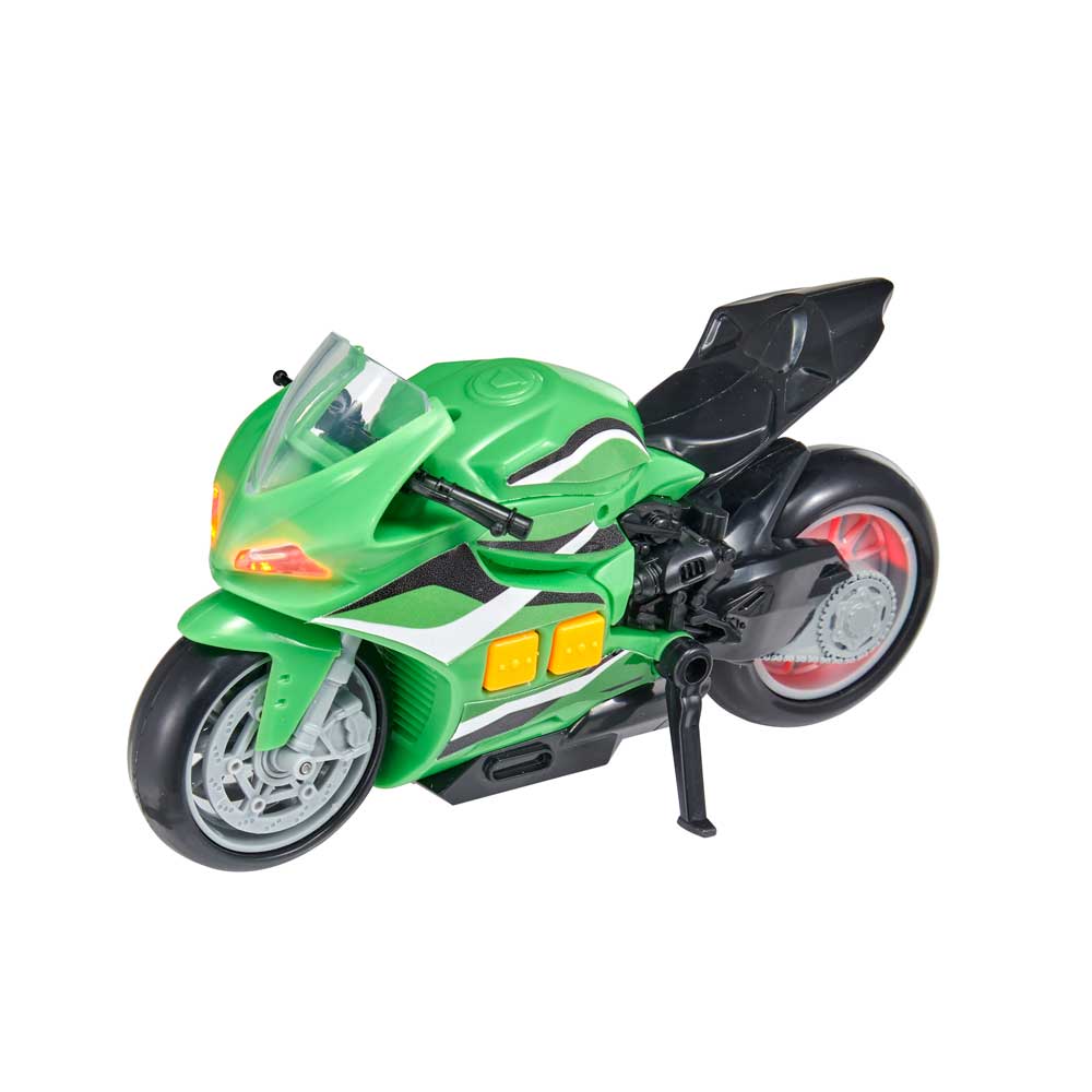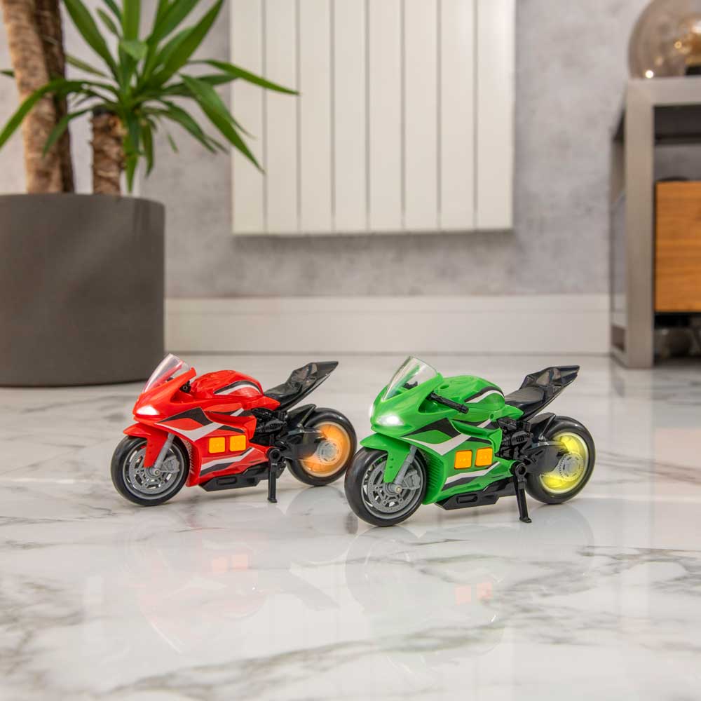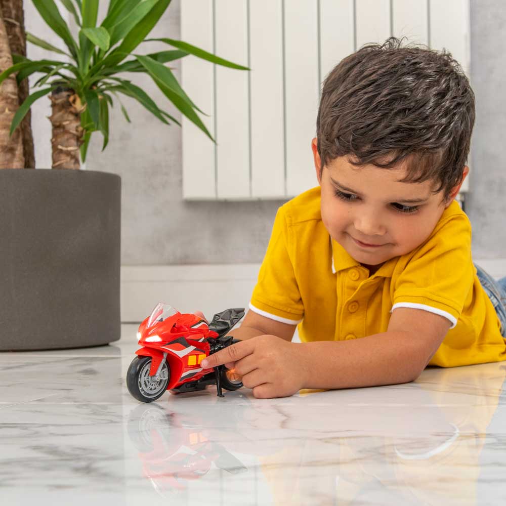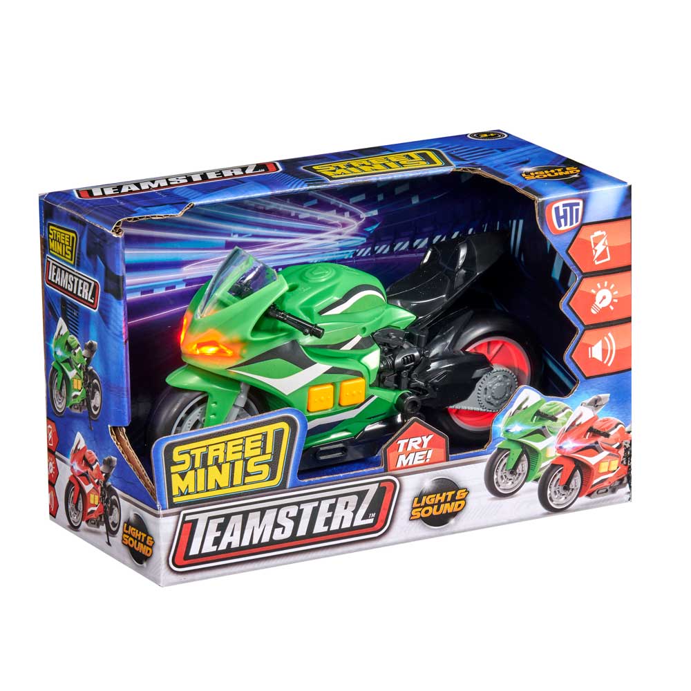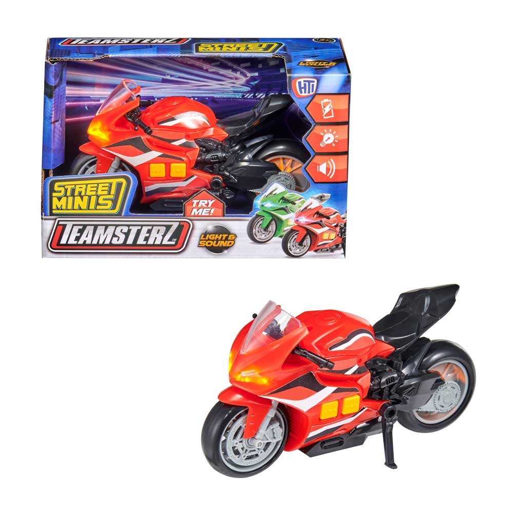 Ускорете действието с мотоциклета Teamsterz Light and Sound Street Minis. Чуйте как двигателят заработва и светнете фаровете с натискането на един бутон. Използвайте стойката, за да паркирате, или завъртете дръжката, за да ускорите в завоите. Помага за развитието на когнитивните и фини моторни умения на вашето дете, тъй като има идеалния размер за игра с бутане. Мотоциклетът със звук и светлина е идеалният подарък за всеки ентусиазиран шофьор и дава възможност на часове въображаема забава. Включва 3x AAA батерии, които са с демонстрационна цел.