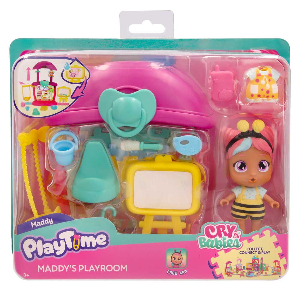 Създай вълшебни моменти с интерактивните комплекти Cry Babies PlayTime! Всеки комплект представя различна обстановка – детска градина, баня или стая за игри – пълна с активности, изненади и аксесоари, които вдъхновяват въображението и ролевата игра. Детската градина на Джена идва с 18 магически изненади в стил къща за кукли! Включва интерактивни елементи като пързалка, асансьор-столче, въртележка, часовник за дейности и още. Баня на Бела има 14+ аксесоара, включително вана, тоалетна, мивка, четка за зъби, дрешки и тайна магическа изненада, разкрита с истински сълзи! Игралната стая на Мади съдържа 13+ артистични аксесоара като люлка, дъска, кофа с боя, четка, дрехи и изненада с магическо разкриване. Игралните комплекти могат да се свързват помежду си, за да създадеш невероятен Play Time Day Care свят на игри и забавления! (Всеки се продава отделно.)