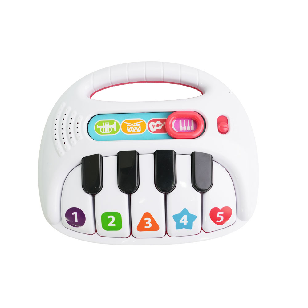„Новите Моцарти“ показват таланта си още от момента, в който започват да подскачат в ритъма на любимите си мелодии или да пеят заедно с популярни песни. С това весело пиано амбициозните музиканти със сигурност ще задоволят любопитството си към музиката. Натискайки клавишите на пианото, децата могат да слушат забавни мелодии и звуци от музикални инструменти. Четири различни режима на пианото създават благоприятни условия за лесно и забавно учене на числа, форми и цветове! Работи с 3 ААА батерии, които са включени с демонстрационна цел.