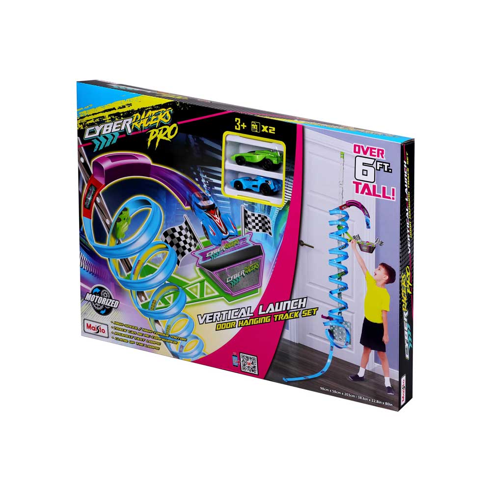 Приготви се да изстреляш количката си в стратосферата! Пистата Door Hoop виси от вратата с множество лупинги за изкачване, докато стигнеш до върха. Можеш ли да стигнеш до финалната линия? Състезавай се с включените две колички и виж кой ще победи! Включва две превозни средства с механизъм за издърпване Cyber ​​Racer, писта с 10 лупинга, конектори, закачалка за врата и връщаща секция с цел. Висока над 180см!