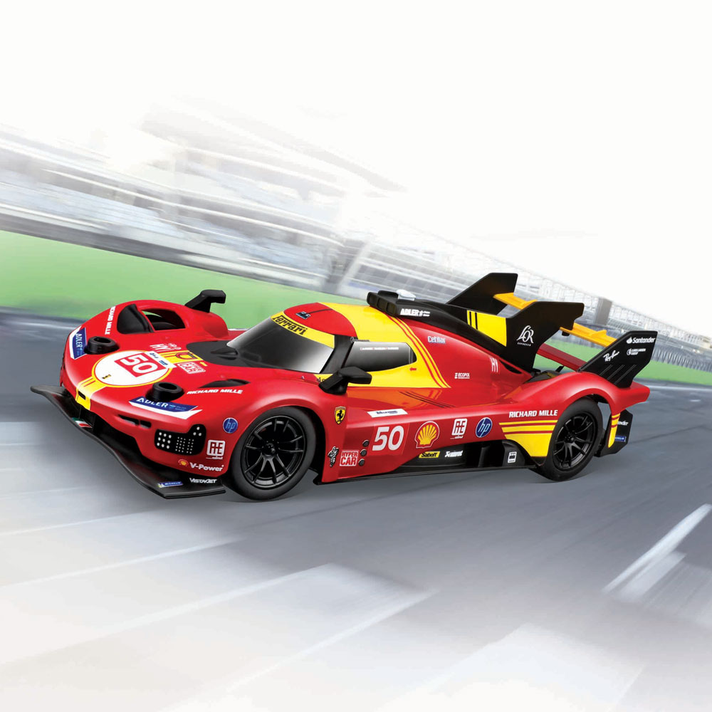 Усети вълнението от състезанията с този качествен модел в мащаб 1:24, който възпроизвежда детайлно Ferrari 499P, участвало на престижното състезание 24 часа на Льо Ман. Проектирана с всеки детайл от оригиналния модел и изработена от най-висококачествени материали, тази играчка в мащаб 1:24 ти дава шанса да усетиш прилива на адреналин от най-престижните състезания в света. Това пълнофункционално RC превозно средство се управлява лесно благодарение на интуитивния контролер, включен в кутията. Работи на 2.4G честота. За контролера са необходими две батерии ААА.