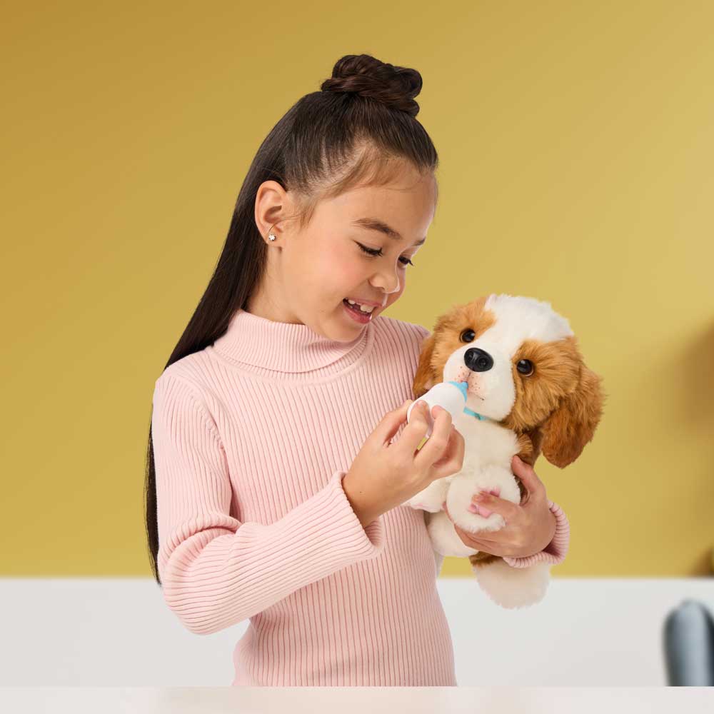 Little Live Pets My Really Real Puppy – Patches бигълът е най-истинското кученце, което някога си виждал! Patches изглежда толкова истински с най-меката козинка, най-сладко мигащите очи и реагира на докосването ти с над 60 звука и реакции. My Really Real Puppy ще бъде твой верен приятел завинаги – това интерактивно кученце е като истинско! Опознай твоето кученце, като леко натиснеш носа му и то ще подуши или оближе ръката ти. Погали Patches по главата или гърба му и той ще издава щастливи звуци и ще мига с очи. Колкото повече го галиш, толкова повече ще се вълнува! Patches се предлага с шишенце и обича да бъде хранено – леко притиснш бутилката към устата му и го слушай как затваря очи и издава сладки хапващи звуци. След като нахраниш Patches го сложи да легне настрани за дрямка – той ще усети позицията си и ще заспи. Patches обича да спи в кучешкото си легло, просто махни горната част на коша за кученца, за да го трансформираш в кучешко легло. Очарователният кош за кученца има и с дръжка, за да можеш да го носиш със себе си, където и да отидеш! След като се запознаеш с Patches не забравяй да попълниш сертификата за осиновяване. Изживей най-реалистичната и очарователна интерактивна игра с кученцето Little Live Pets My Really Real Puppy – Patches.