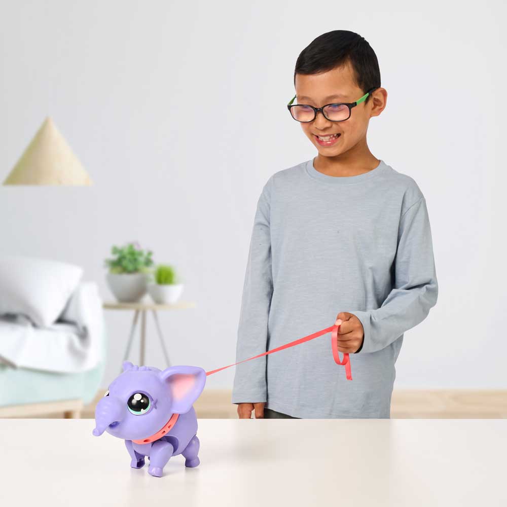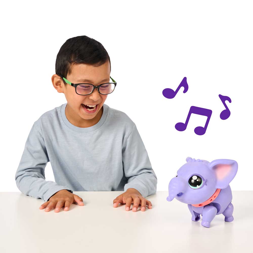 Изпитай радостта да имаш свой домашен любимец слонче с Little Live My Pet Elephant! Toots се движи и звучи точно като истинско слонче. Нахрани я с шишето й и я гушкай, докато реагира на докосването ти. Гледай как хоботът й се люлее и ушите й мърдат, докато върви! Toots издава толкова много забавни и сладки звуци – тя се храни, кикоти се, подушва, киха и дори може да изпусне забавно пръцкане! С над 25 звука и реакции, Toots е идеалния малък спътник! Toots има сладки мърдащи се уши и хобот, когато ходи. Прикрепи каишката й, за да я изведеш на разходка или гледай как се движи и танцува на собствените си музикални мелодии. Toots идва с каишка за ходене, шише за хранене, книжка с инструкции и батериите са включени, така че тя е готова за игра!