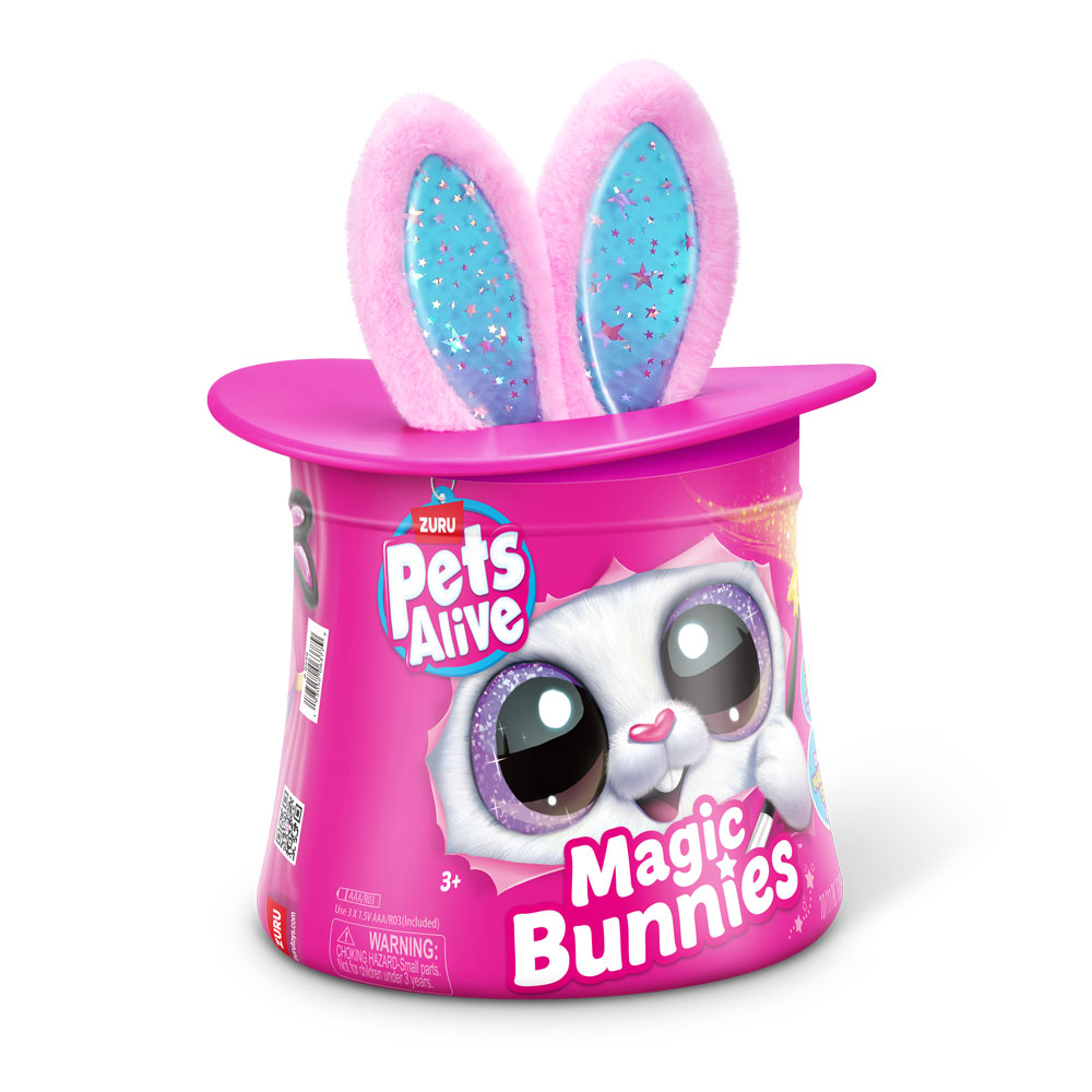 Абракадабра! Запознай се с твоя най-сладък нов магически асистент с Pets Alive Magic Bunnies. Размахай очарователната си звездна пръчица, за да видиш как ушите на зайчето светват и магията започва… Слушай мистериозните звуци на заклинанието! ТА ДААА…Издърпай твоето зайче и виж как изскачат конфети. Кое магическо зайче ще извадиш от цилиндъра – черното, розовото или бялото? Цели 3 за събиране, всяко се продава отделно. Открий тайното отделение – колко вълшебни мини зайчета ще намериш скрити вътре? Всяко зайче идва със собствен уникален магически трик! С над 20 завладяващи интерактивни изненади и функции, има толкова много магическо забавление!