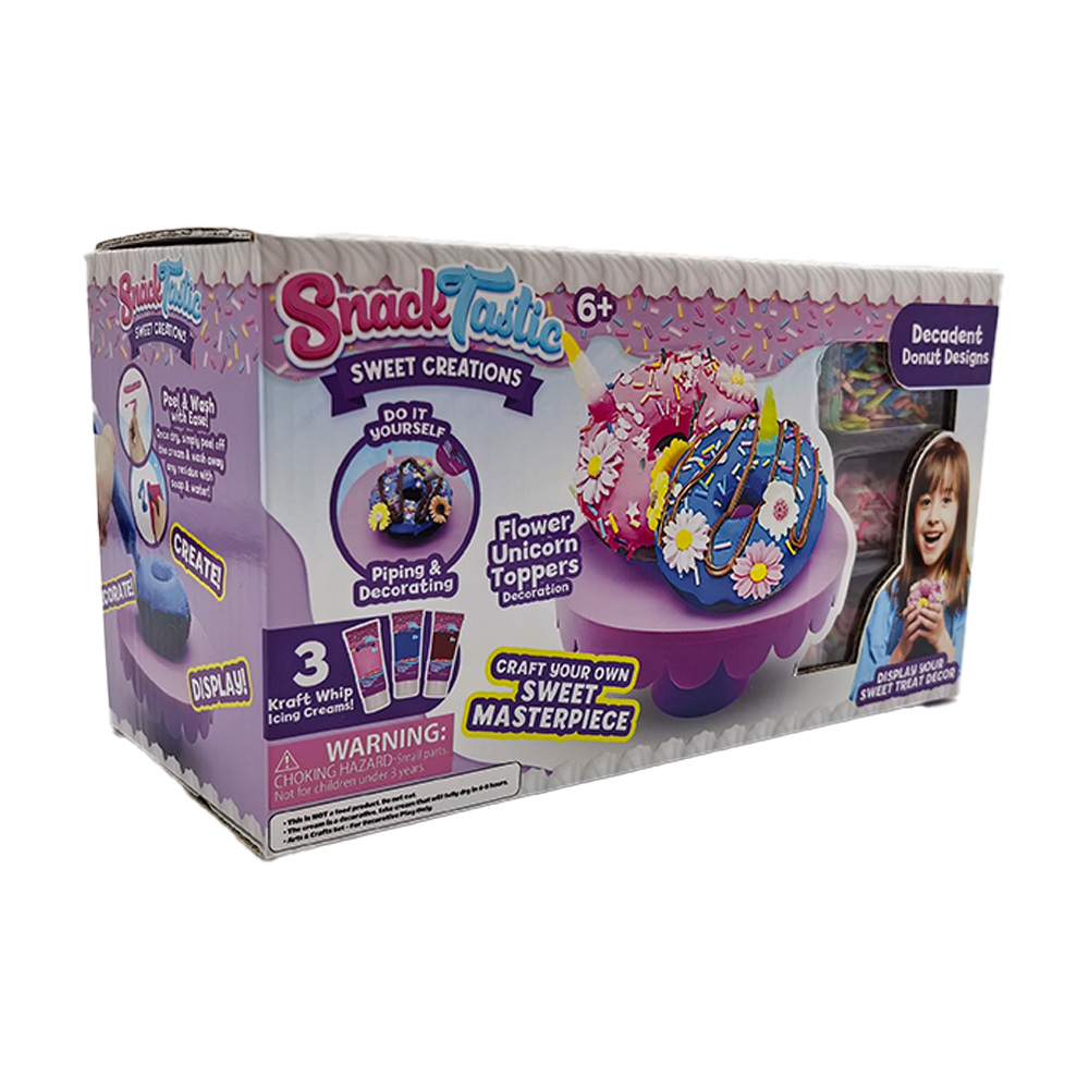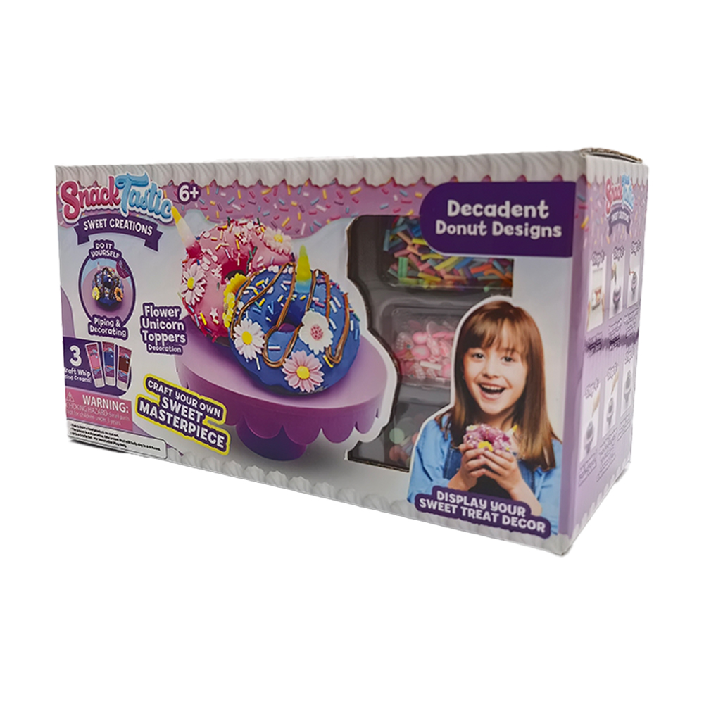 С този творчески комплект децата могат сами да „приготвят“ и украсяват сладки изкушения, вдъхновени от любимите на всички понички. В кутията ще откриете всичко необходимо за игра: материали за шприцоване и декорация, специален крем-глазура и различни поръски и декорации за завършек. Комплектът е подходящ за деца над 6 години и е идеален за развиване на въображението, фината моторика и креативността. Готовите „сладки шедьоври“ могат да бъдат изложени като част от играта или колекцията. Продуктът имитира храна. Не е предназначен за консумация!