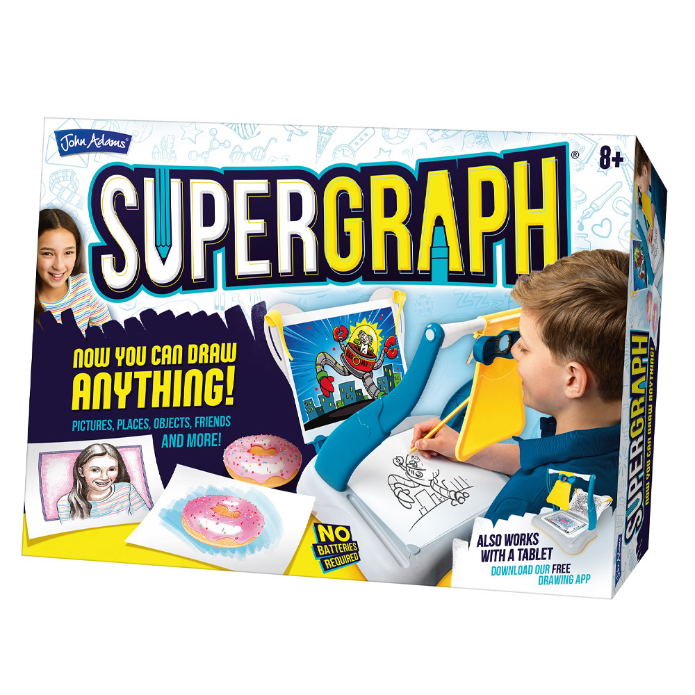 Превърни се в истински художник с уникалната система на Supergraph! Избери си картина и я пресъздай бързо и лесно – просто погледни през окуляра и тя ще се появи на листа ти! Можеш да рисуваш дори от таблет или да вземеш Supergraph навсякъде със себе си и да рисуваш реални обекти от заобикалящия те свят! Supergraph има олекотен дизайн и не са необходими батерии за използването му. Комплектът включва: Supergraph проектор със статив за картина; 2 изображения, с които да се упражняваш; Бели листове за рисуване; Инструкции за използване. Подходящо за деца над 8 години.