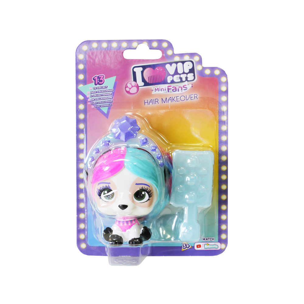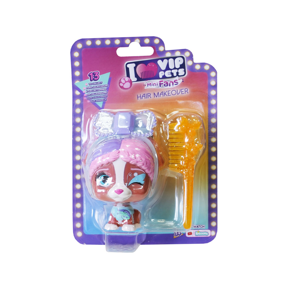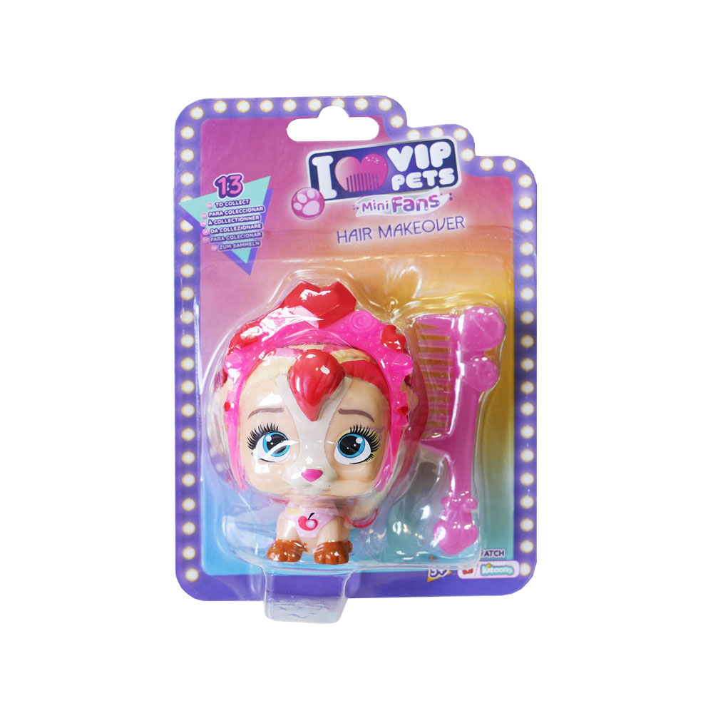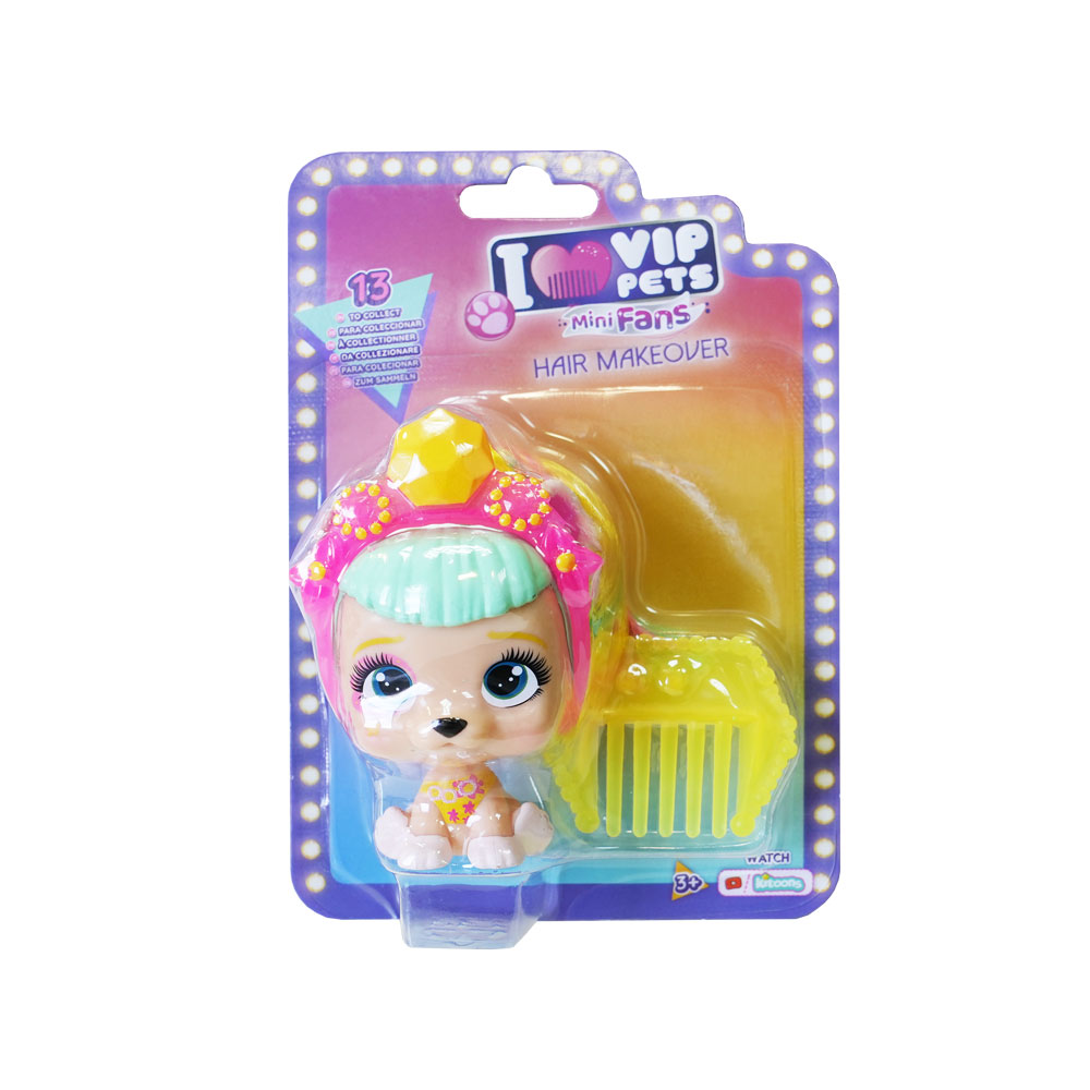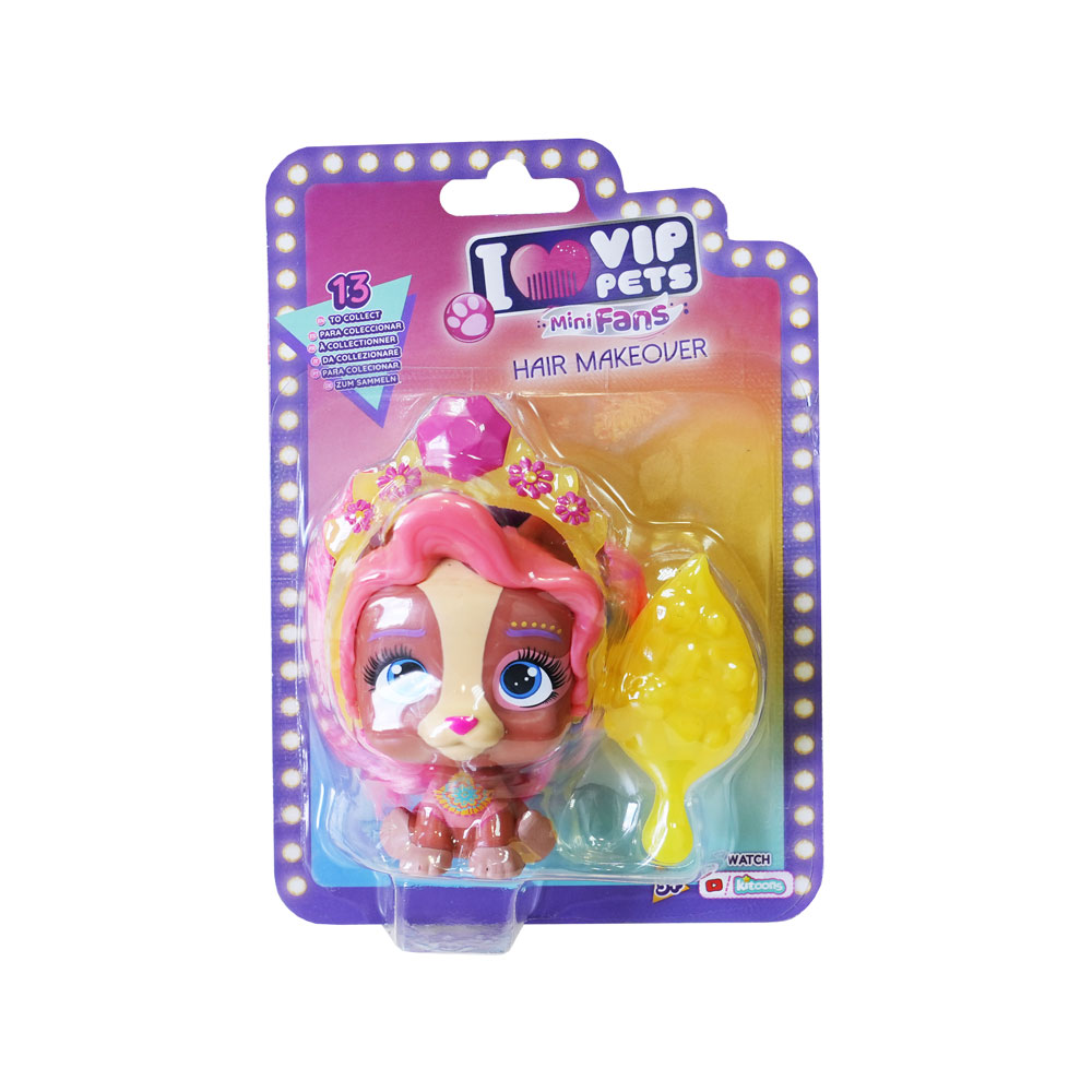 Модните кученца Vip Pets са отново тук, по-стилни от всякога! VIP Pets Hair Makeover са най-модерните кученца със супер дълга коса за стилизиране! Всяко кученце има различен уникален стил със свой собствен характер и хобита. Въпреки това, има нещо, което ги свързва – тяхната страст към прическите! VIP Pets обичат да носят косата си в различни стилове в зависимост от повода, но се нуждаят от твоята помощ, за да създадат перфектната визия – оформи прическата им с включеното гребенче! Създавай уникални визии, които подчертават индивидуалността и стила на всяко модно кученце Vip Pets Hair Makeover Mini Fans!