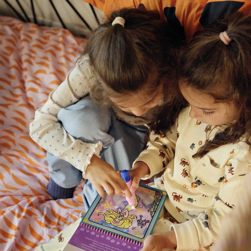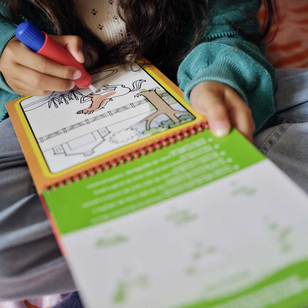 Оцветяване без никакъв безпорядък! Тази забавна книжка за рисуване с вода включва 4 многократно използваеми страници и пълнима водна писалка. Просто напълни писалката и оцвети сцените – с всеки щрих ще се появяват ярки цветове и скрити детайли! След като страницата изсъхне, рисунката изчезва и можеш да оцветяваш отново и отново. Удобната водна писалка с дебел корпус е лесна за хващане от малките ръчички и се съхранява в капака на книжката – идеална за пътуване, разходки и забавление навън! Подходяща за деца на 3+ години.